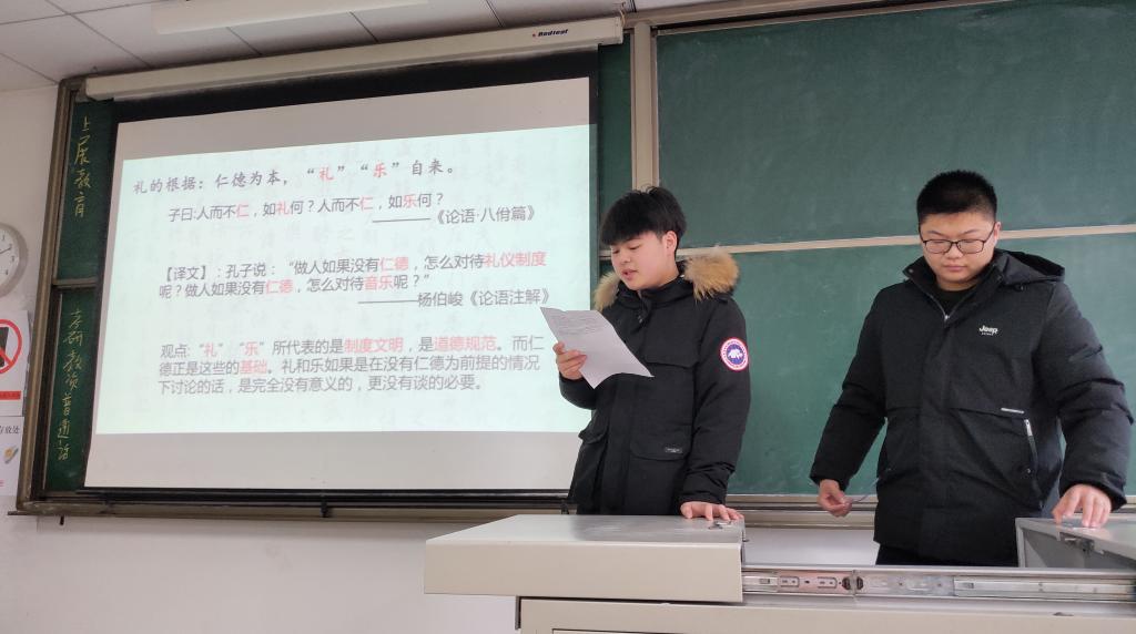在结合《论语》探讨孝的话题中,同学们大致从爱、养、敬、继志等角度对孝所涉及的内涵层次做了梳理和阐述,举例到给父母打电话、关心父母的身体、做好自己的事不让父母担忧、坚持父母传授的正当原则等等,都比较能贴近自己的生活去谈理解。