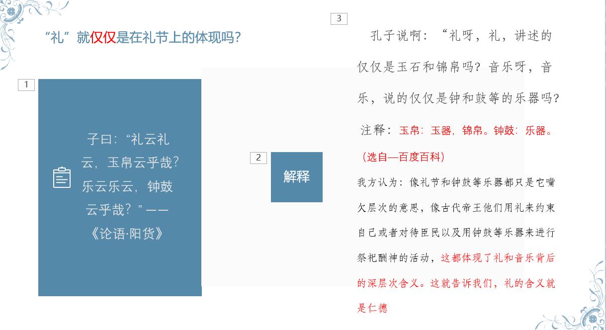 如果人没有仁德,是无法切实地践行礼乐的。这是为什么呢?前一段我们分析了“情感”是礼仪中最重要的元素,而礼仪中的情感具体来说包含关爱、尊敬、真诚等等。那么,在生活中,如果一个人总是向他人表现出这些情感(以及由此而做出的行为),我们如何评价这个人呢?“我们说他品质好。”(学生在课堂上回答)也就是说,由向外表达出的美好情感、行为,我们得以见证一个人内在的品质(仁德)。而一个内在葆有仁德之人,又必定能向外对他人展现出情感与关怀。