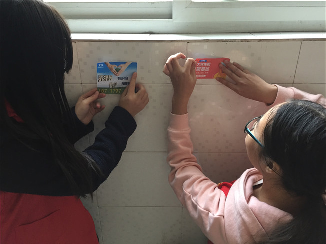 2016年11月30日,远景学院的志愿者们在c6宿舍楼发现,楼梯的过道、寝室的门上、走廊两边的墙上都被贷款广告侵占。甚至连宿舍楼的入口处,也贴着贷款小广告。广告上无一例外的写着“大学生创业助学”、“大学生现金借款”等字样。整栋宿舍楼粗略统计大约有10多张信贷广告。这些小广告看似没有什么危害,但实则却在不断的诱惑着同学们。为了尽量减轻信贷广告对同学们的影响,志愿者们决定清除这些小广告,用自己的力量让同学们远离网络信贷。