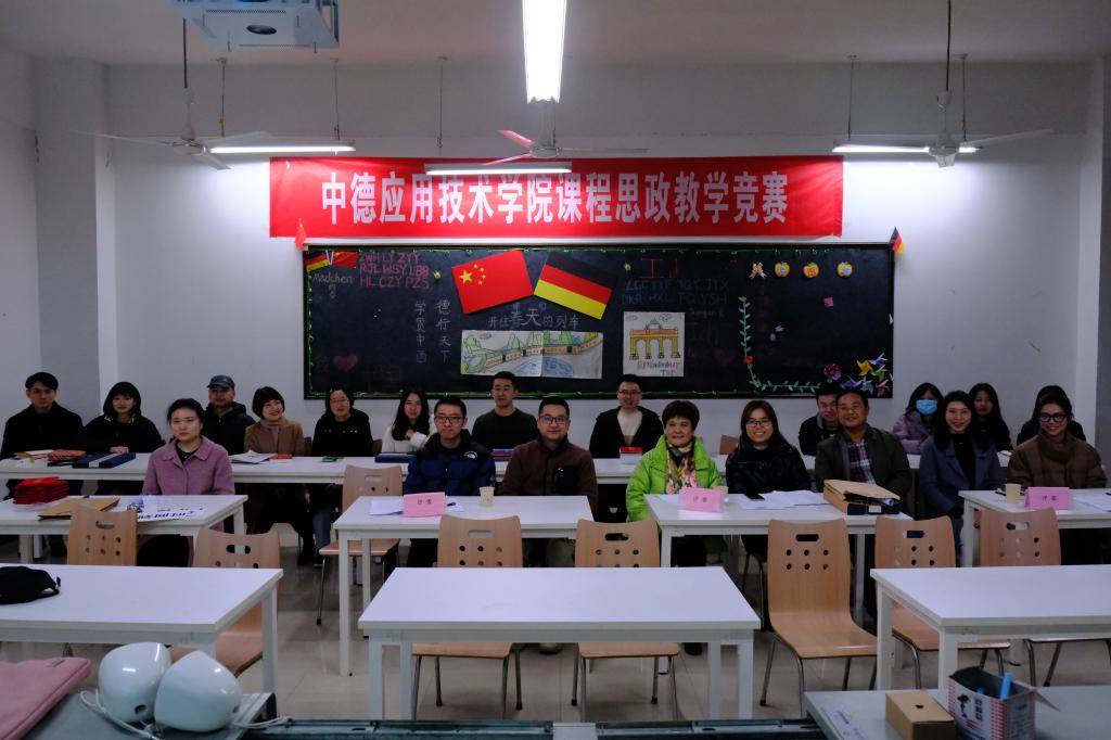 为深入贯彻全国高校思想政治工作会议、全国教育大会等会议精神,落实教育部和学校有关文件要求,发挥教学比赛对课程育人的促进作用,全面提升广大教师开展课程思政建设的意识和能力,助力学校人才培养育人和育才相统一,中德应用技术学院于12月8日在6202教室举办首届课程思政教学竞赛。本次竞赛特邀通识教学部兼校督导金光美教授与思政教学部教研室主任李阳老师担任评委,评审团还包括校长助理、中德应用技术学院院长尹浩亮与中德应用技术学院副院长侯宇晶。