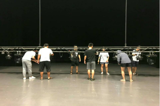 (团队成员投入缤果大剧院对舞台机械设备进行维护)