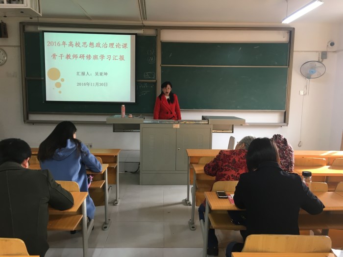 2016年11月30日,思政教学部在1310教室举行“2016年高校思想政治理论课骨干教师研修班培训”经验分享会,此次活动由邓燕主任主持,吴亚坤老师汇报,思政教学部全体教师参加。