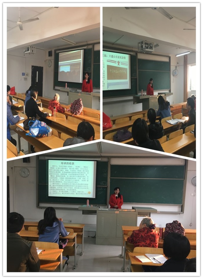 最后,吴老师分享了她在本次研修班的收获。经过此次研修学习,无论在身体上还是在心灵上都受到了中国共产党革命精神的洗礼,特别是为期四天的兰州市外的实践教学与革命教育实践基地考察,让她对党中央的历史,特别是党在甘肃革命老区的奋斗历史有了更加直观的认识,加深了对红军长征等重大历史事件的理解,对于今后领会教材精神、钻研教学内容、改进教学方法、增强思想政治理论课教育教学的针对性、实效性、吸引力和感染力,将起到巨大的推动作用。吴老师的精彩汇报赢得了全体教师热烈的掌声。