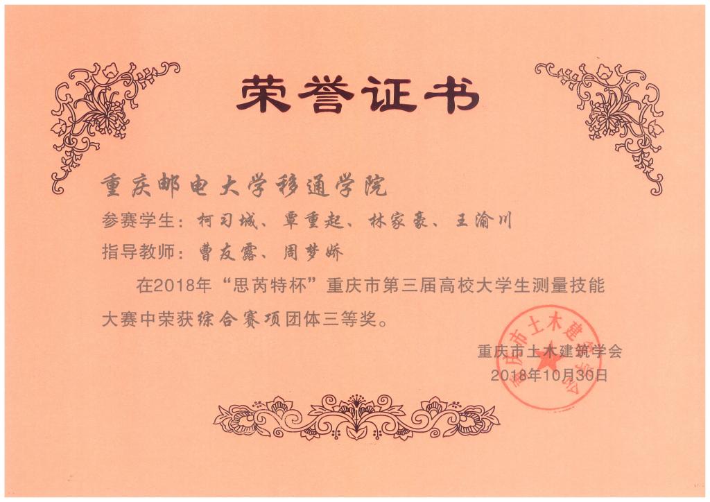 2018年10月26日至28日,由重庆市土木建筑学会主办、重庆交通大学承办的重庆市第三届“思芮特”杯大学生测量技能竞赛在重庆交通大学双福校区举行。本次大赛汇集了来自重庆大学、重庆交通大学、重庆科技学院等18个本专科院校派出的38支队伍、约200人参加比赛。本次竞赛包含四等水准测量、二级电磁波导线测量和GNSS数据采集三个单项。我校管理工程系工程管理专业曹友露老师带领两支队伍参加此次比赛,同学们本着“学习第一、比赛第二”的原则,经过激烈角逐,最终由2016级工程管理专业的柯习城、王渝川、覃重起、林家豪组成的参赛队斩获综合赛项团体三等奖。
