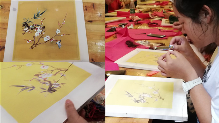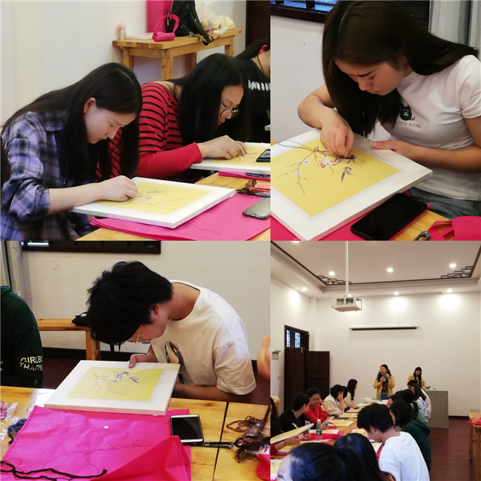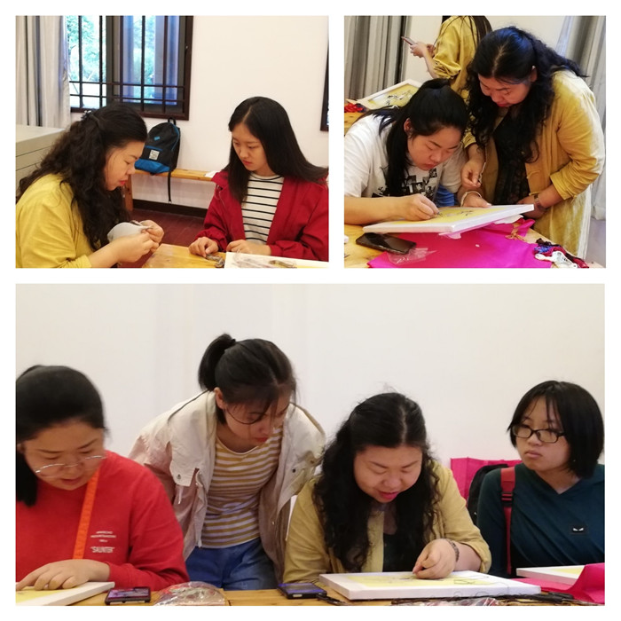 单大琼老师详细的为同学们讲解了如何分线的问题,并实际操作,告诉研究员们分线注重两手并用,一只手捻着线,另一只手快速将线分开,讲究“快、准、狠”。与此同时,单大琼老师指出绣品的不同决定了线的粗细也不尽相同,她表示可以根据绣品将线分成不同厚度,比如:二分之一的线、四分之一的线等等,而这些线的区分需要同学们以后所研究学习。接着,单老师一对一进行针法的教学,指导同学们分线和绣品的制作步骤。