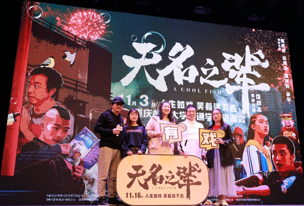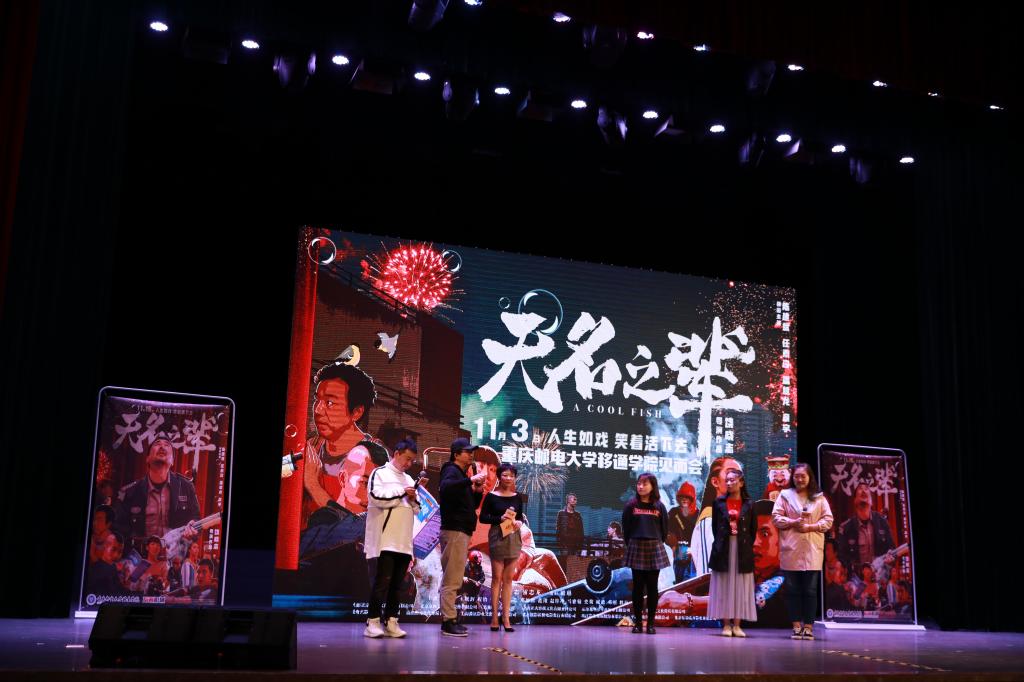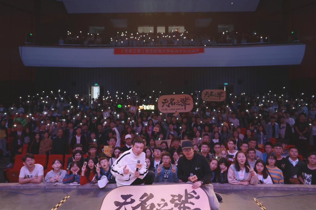 “以你之名,笑痛心扉!我不是无名之辈!”2018年11月3日,由爱莲书院、花果书院和鱼城书院联合承办的电影《无名之辈》“以你之名,笑痛心扉”主题路演在重庆邮电大学移通学院缤果大剧院举行。知名青年导演饶晓志与主演潘斌龙惊喜现身,与莘莘学子近距离分享影片创作理念及台前幕后,现场携手千名学子为“我不是无名之辈”经历过往大胆发声。