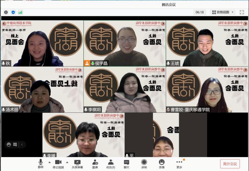 为进一步实施“人才强校”战略,加强师资队伍建设,促进青年教师的成长和成才,全面提高学校的教育教学质量,根据《重庆移通学院关于培养青年教师的通知》和《重庆移通学院关于成长导师聘任的通知》,中德应用技术学院(以下简称中德学院)为本院青年教师请来两位成长导师,并于1月27日组织召开青年教师和导师的线上见面会。浙江大学的李媛教授、西南政法大学的石平教授以及中德学院青年教师曹雪姣、汤术丽、谭劲秋、王琥、李祺玥等五位老师参加会议,侯宇晶副院长主持会议。