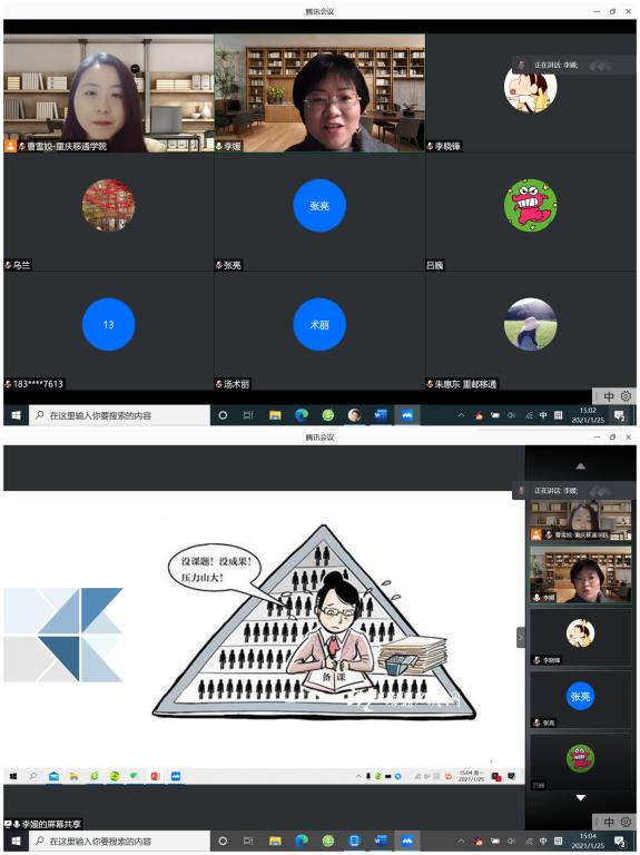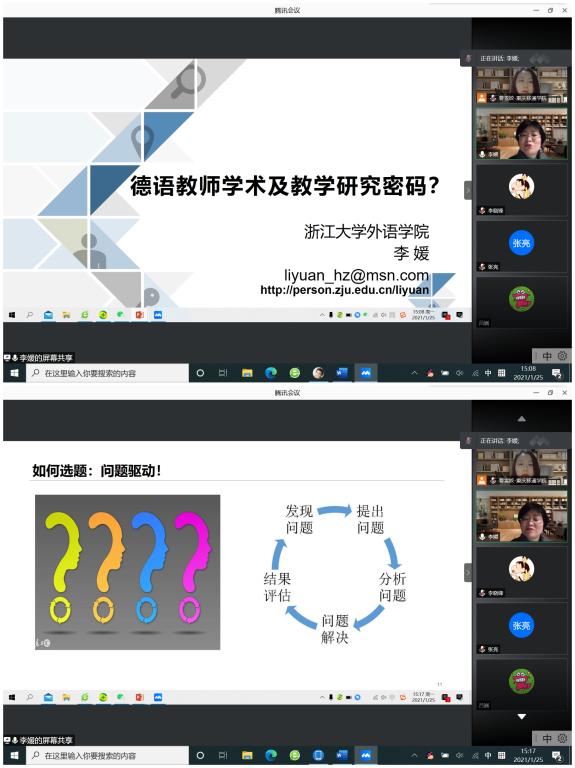 李教授以“德语教师学术及教学研究密码”为主题,从研究问题、研究方法、研究结果三个方面完整讲述了科研工作的开展流程和注意事项,强调问题导向,突出科研结果的“新”。基于非通用语种开展科研的困境,李教授鼓励大家开展跨学科的研究,积极借鉴社会学、新闻学、心理学等其他学科的成熟方法,不要仅仅局限于德语或外语学科。讲座结束后李教授就老师们的提问,给出了中肯的建议,并提供了许多语言学及社会学的参考书供参阅。