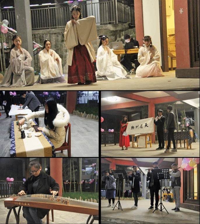酒会期间,华韵汉服社带来《山鬼》舞蹈,优美舞姿让同学们流连忘返;茶学社的茶艺表演与书法协会的笔墨艺术,在主持人的冬至习俗知识讲解中相得益彰;笛箫协会的多人合奏,音韵悠游柔转,悦耳动听;古筝社的铮铮琴声,动人心魄,意境燎原。