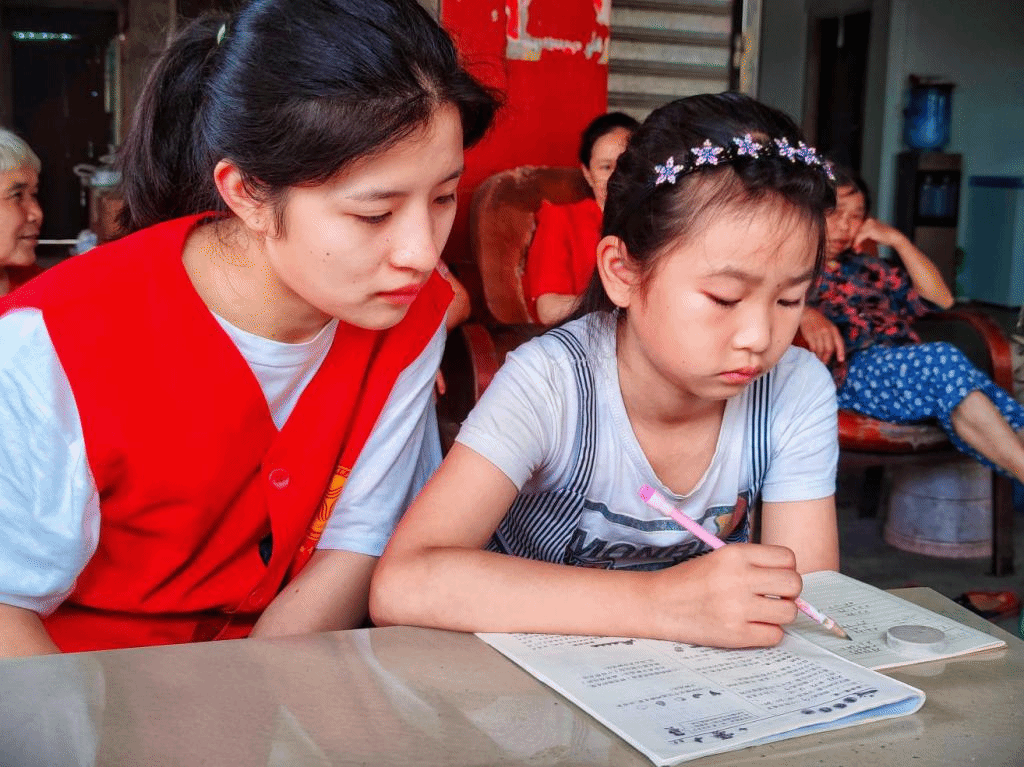 在日出而作、日落而息的松溉镇上,“繁花硕果”乡村振兴青春行动队在松溉幼儿园集合,开启了朝气蓬勃的一天。队员们在老师的带领之下,穿过长长的石桥,爬过弯曲的山路,来到一片宁静的乡村。高低错落的石瓦房为留守儿童遮风挡雨,小小的房子里藏着大大梦想。小朋友们青春洋溢的气息,让队员们拾起了潜藏在内心的那份少年感,重回少年时代,热情的投入到志愿服务之中。在合理分配具体的教学任务之后,队友们以“一对一”的辅导形式为社区的孩子们解疑答惑,让孩子们先独立思考再进行针对性辅导,通过这样的方式来锻造孩子们的独立思考能力,同时为孩子们解答不会的难题、巩固已会的知识。在过程中,孩子们主动询问不会的知识点,让队员们看到了孩子们在学习方面极高的可塑性和积极性。当队友们看到孩子们眼中对知识的渴求、家长们欣慰的笑容时,这一切的汗水都变成他们继续前行的不竭动力。