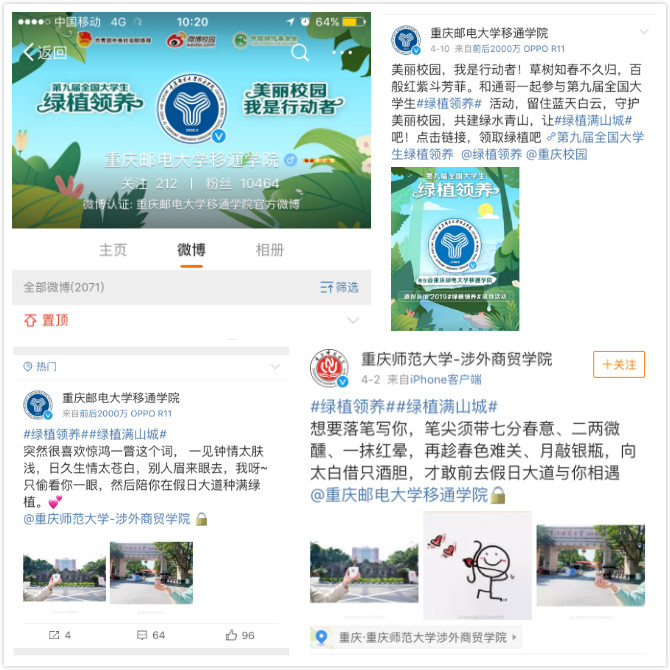 为了让更多同学认识环保的作用,倡导学生积极投身身边的环保事儿,学校新闻中心官方微博以#绿植领养#为话题展开了积极了互动,以绿植领养带动校园环保氛围,期间校级间也就绿植领养活动项目展开了互动。