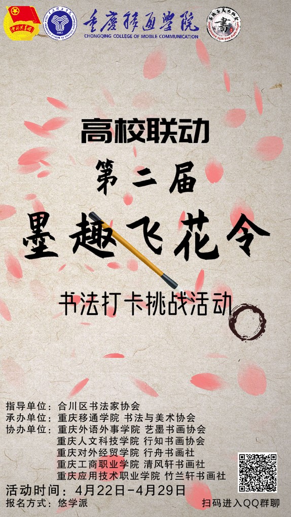“春城无处不飞花,寒食东风御柳斜。”继2020年4月疫情网络课堂,书法与美术协会推出“七校联动·墨趣飞花令七天打卡挑战活动”取得圆满胜利。2021年4月22日,书法与美术协会联合重庆市内其他5所高校共同推出以重庆市合川区书法家协会为指导单位,共青团重庆移通学院委员会为主办单位的“第二届墨趣飞花令”书法打卡挑战活动。