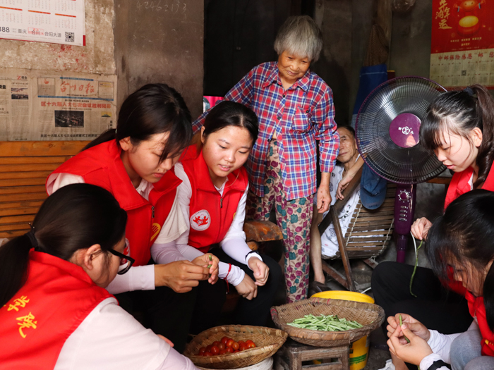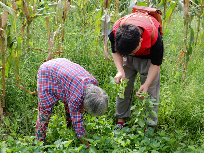 随后队伍成员们帮助爷爷奶奶摘菜、做农活,成员们和爷爷奶奶围坐一圈,听爷爷讲述入党的故事和草街街道对于党员的相关政策。通过跟爷爷的交流中不仅坚定了队伍成员们的入党决心,更让成员们在学习工作生活中向老党员看齐,更加严格要求自己。