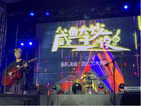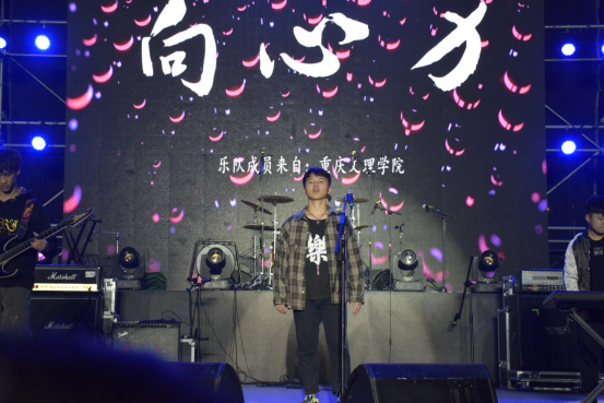 短暂落幕后,灯光乍亮,已经在台上摆好pose的正是由西南政法大学和川外南译学院组成的kua乐队。简单随性的服装,独具特色的曲风,主唱那饱含力量的歌声伴随着乐器的激情碰撞,一首原创摇滚完美演绎他们的呐喊,夜晚不再平静,移通就此绽放。