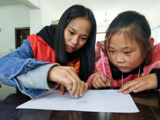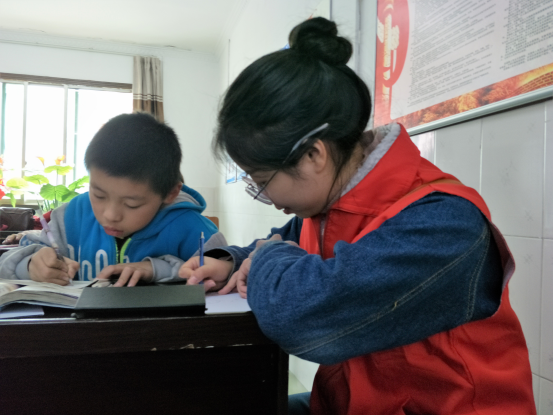 来到教室,孩子们安安静静地拿出课本和作业开始书写起来。在志愿者的帮助下,整个教室只有沙沙的翻书声和笔尖在纸张上划动的音响,志愿者温柔的解释声也穿插其中。紧紧相挨的人儿将温暖传遍了教室的每个角落,或许是因为信任,又或许是因为志愿者和孩子都将心中最柔软的地方交给了对方,我们用笔墨描绘共同的文字色彩,所以当屋外阴云满天,屋内仍是相依相偎暖心汇。