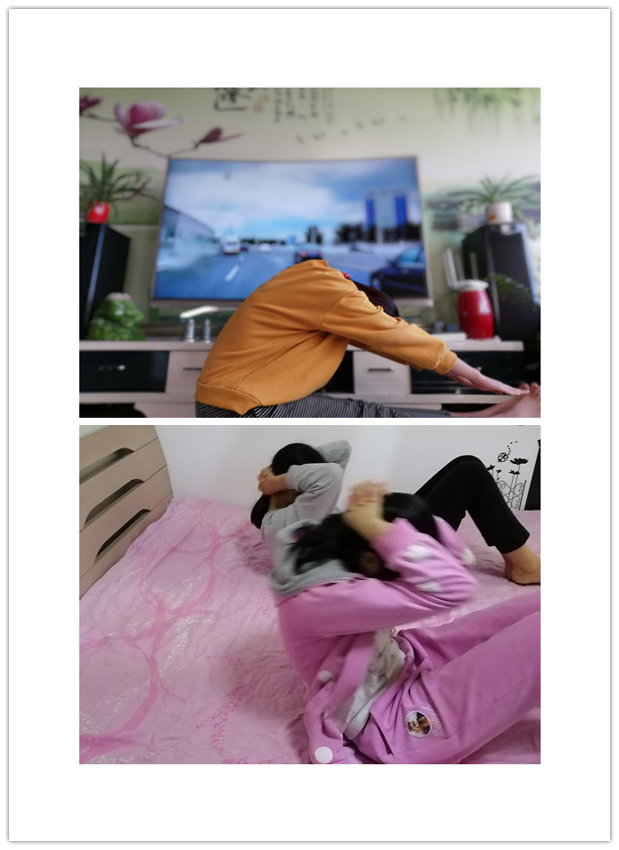 许佳同学做着拉伸运动,胡燕同学和妹妹做着仰卧起坐。看来女孩儿也不输给男孩儿呢!