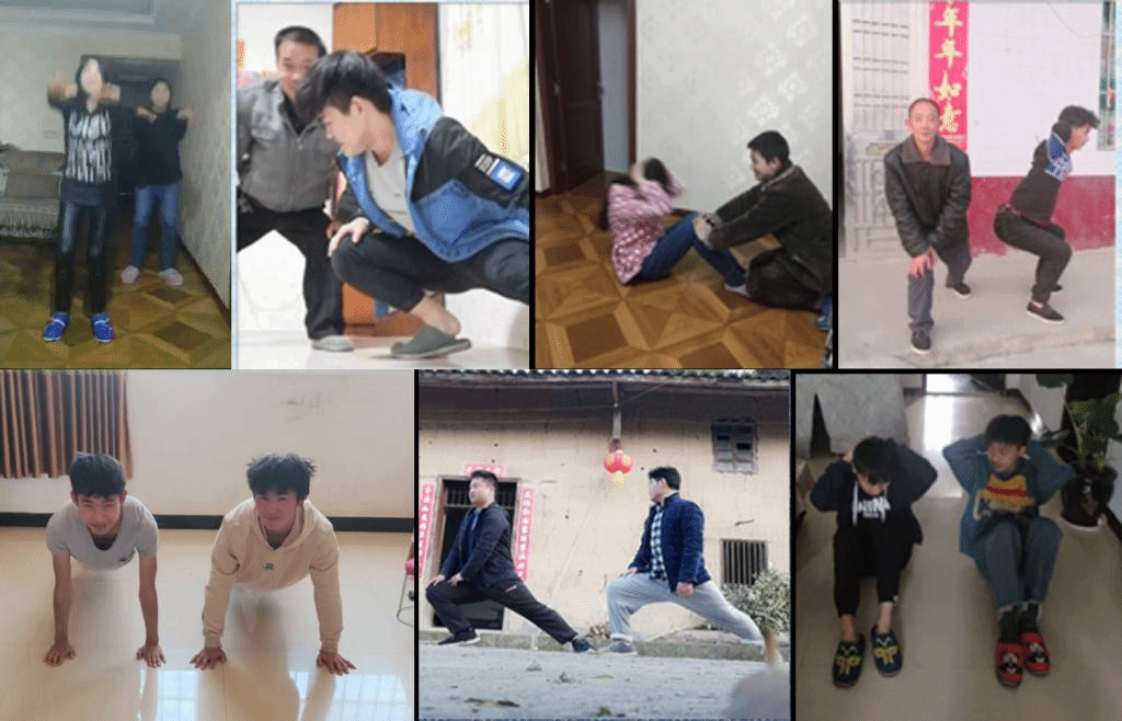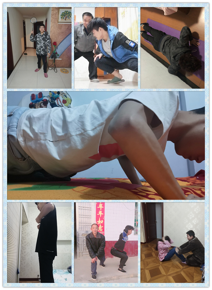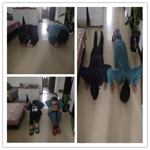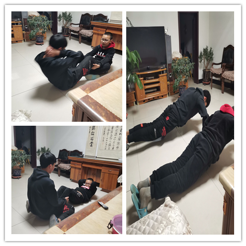 除此之外,还有很多同学与家长一起经常锻炼着!郎渝翔同学和家长在家里打羽毛球,想问家里天花板这个高度打起来是什么感觉啊;杨帅同学和爸爸做着斜压腿动作,不知道接下来会干什么呢;杨龙同学和刘凌同学都做着俯卧撑;周义清同学做着手臂上提动作;陈俊发同学和他的父亲进行着晨练;王维维同学和弟弟做着仰卧起坐……看着他们是不是想起来动一动啦!