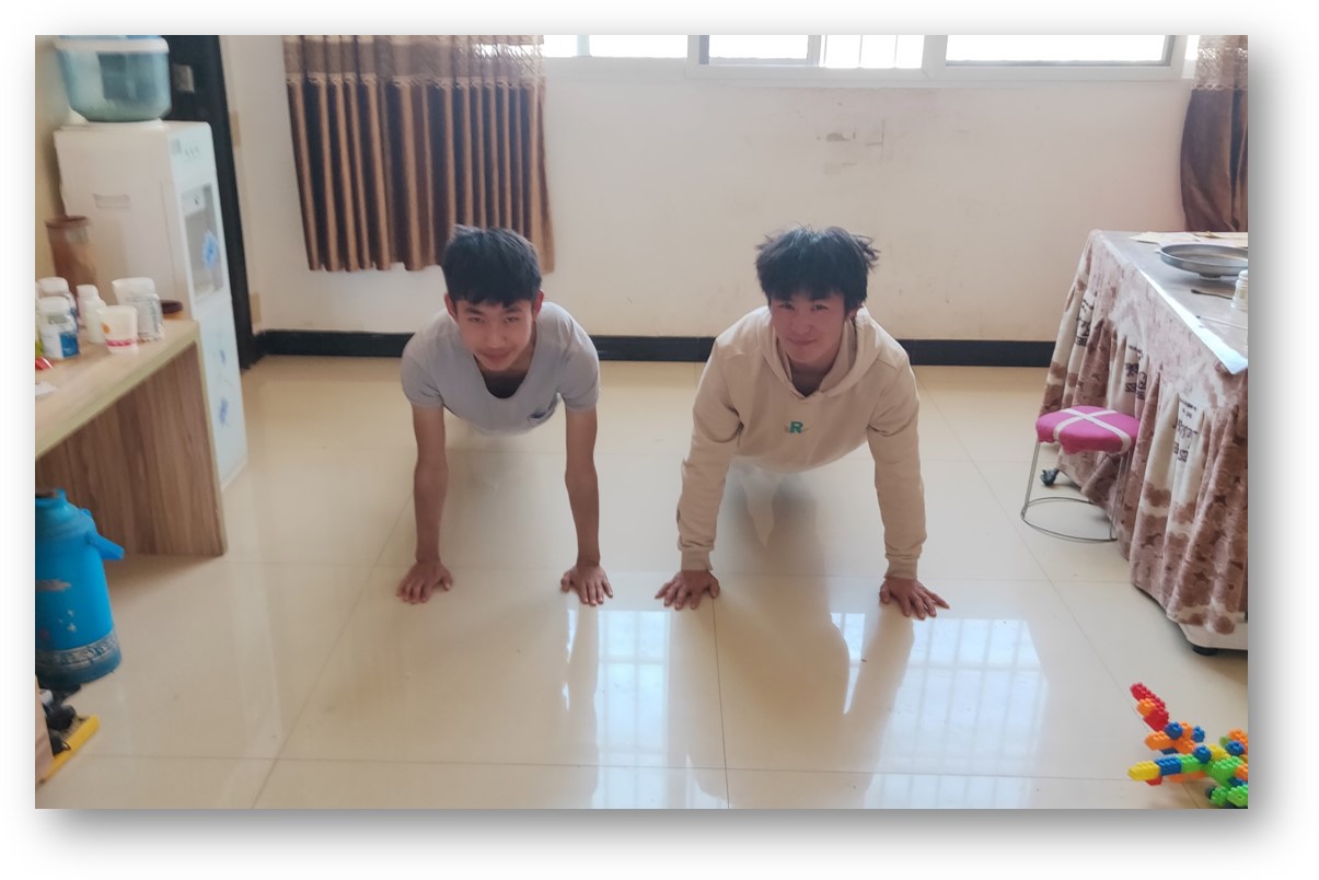 接下来让我们看看张鹏同学和他的弟弟吧,两兄弟正做仰卧起坐呢!想减掉小肚腩的同学在做仰卧起坐时,不必做完整版的哦,只需感受到腹部发力就可以做下一个了。看,他们还在做俯卧撑呐!