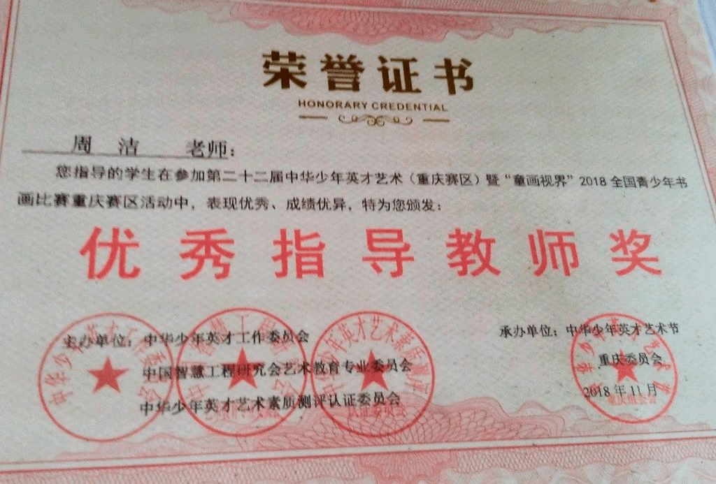 2018年荣获第23届少年英才艺术重庆赛区优秀老师指导奖;