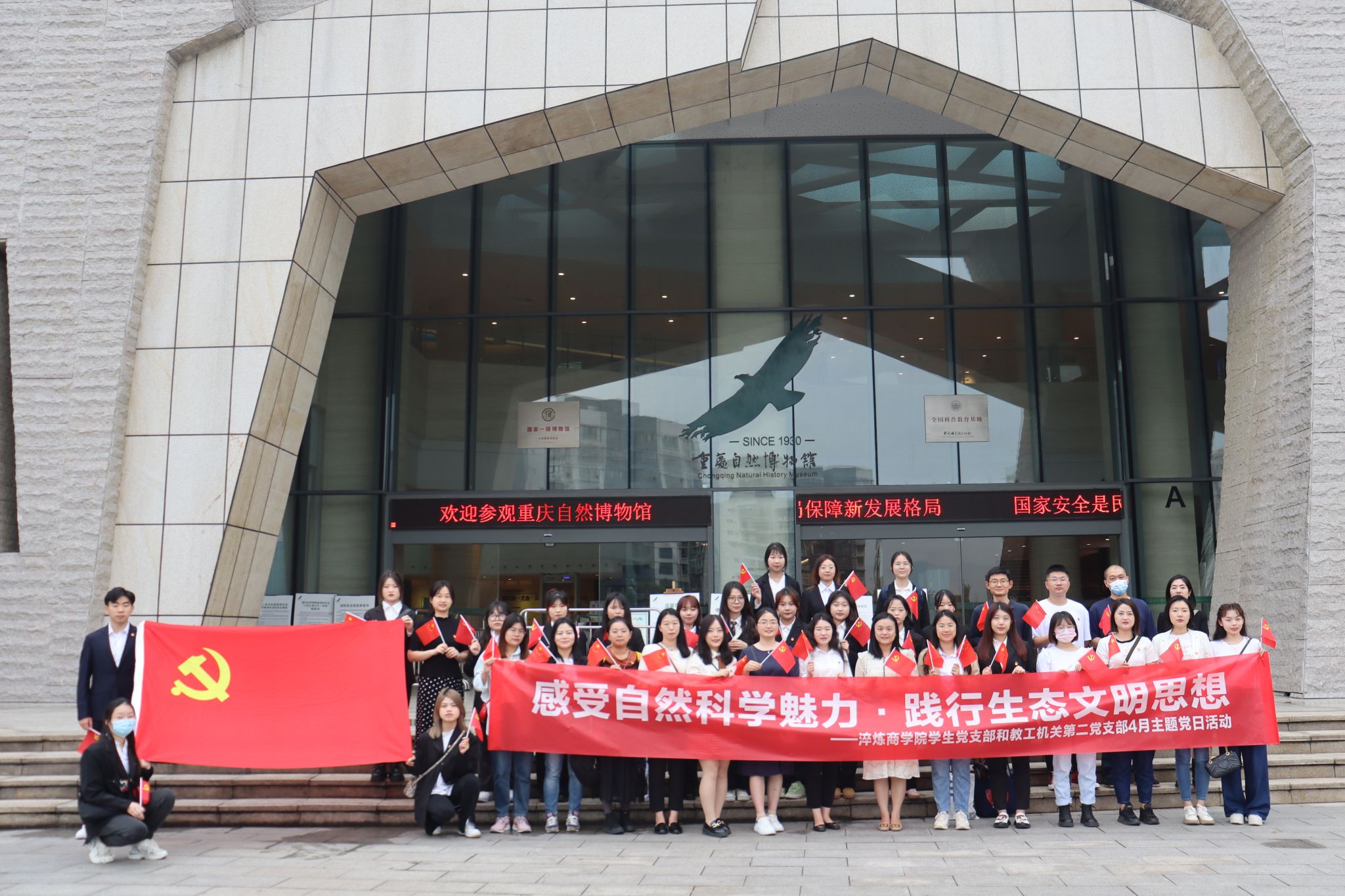为深学笃用习近平新时代中国特色社会主义思想,全面贯彻党的二十大精神,以实际行动践行习近平生态文明思想,感悟生命科学真谛,不断加强思想淬炼、政治历练、实践锻炼,开拓文明视野,砥砺奋斗意志。全国样板党支部淬炼商学院学生党支部发挥示范引领作用,联动教工机关第二党支部于4月21日上午9时前往重庆自然博物馆开展“感受自然科学魅力·践行生态文明思想”4月主题党日活动。