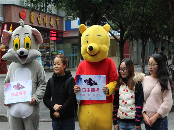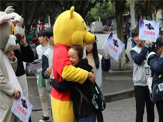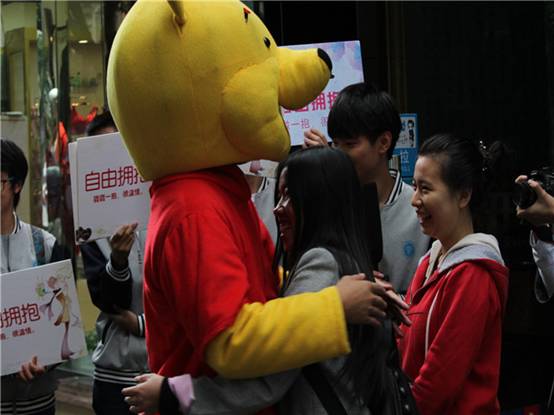 此次“自由拥抱”活动通过陌生人之间的拥抱和微笑,清除了人与人之间的冷漠与排斥,使大家的内心都放松了。也许你不知道,对于一个冷漠或者是悲伤的心来说,你的拥抱和微笑对于他来说代表着什么——温暖、鼓励甚至是希望。相信在此次活动中,每一个人都会有所收获,这些收获可能是简单的快乐,可能是深深的感动,也可能是为自己那封闭已久的内心终于找到了一个出口。此次活动中,同学们战胜了害羞,战胜了被人拒绝后的失落,以微笑的姿态,把更多的爱和温暖传递到需要它的人的身边。
