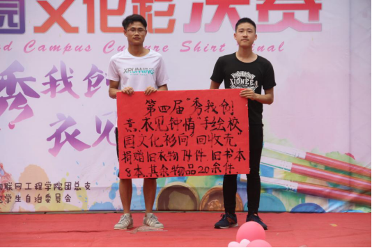 与往年不同的是,本次活动将社团与志愿联合到了一起,选手们用自己闲置的物品来换取创作用的文化衫,共捐赠:旧衣服74件;旧书本8本;其它物品20余件。所有捐赠的物品都会通过我校“回收壳”送往贫困的山区,给他们带去温暖。