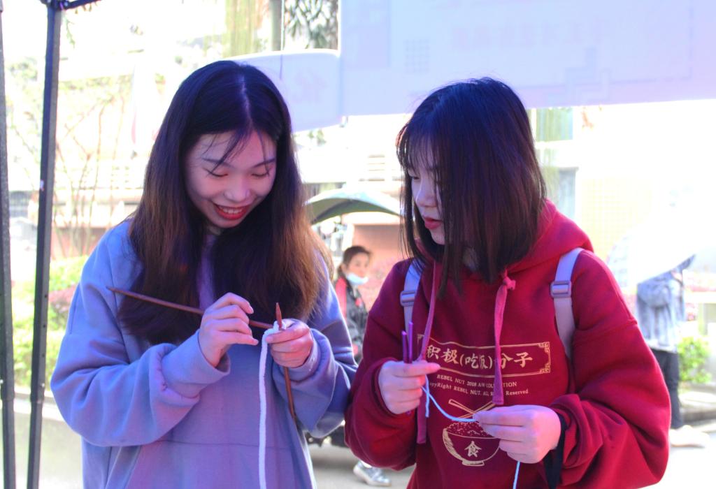 四叶草钉子画,一钉一线,都是耐心的勾勒;复古手工扇,一圈一引,都是情感的结合;花、链一世界,点点滴滴,都是用心的成果。当心灵手巧遇见蕙质兰心,又是一场碰撞,小仙女们各自交流手工心得,还自发为感兴趣的同学提供教学。“我还以为现在很少有人喜欢刺绣了,感觉大家都太忙,这个也很耗费时间嘛!没想到居然在花果遇到了这么多情投意合的小伙伴。”一位小仙女边参观边说。她们相遇花果,感受花果,是共享的流淌,也是互助的陪伴。