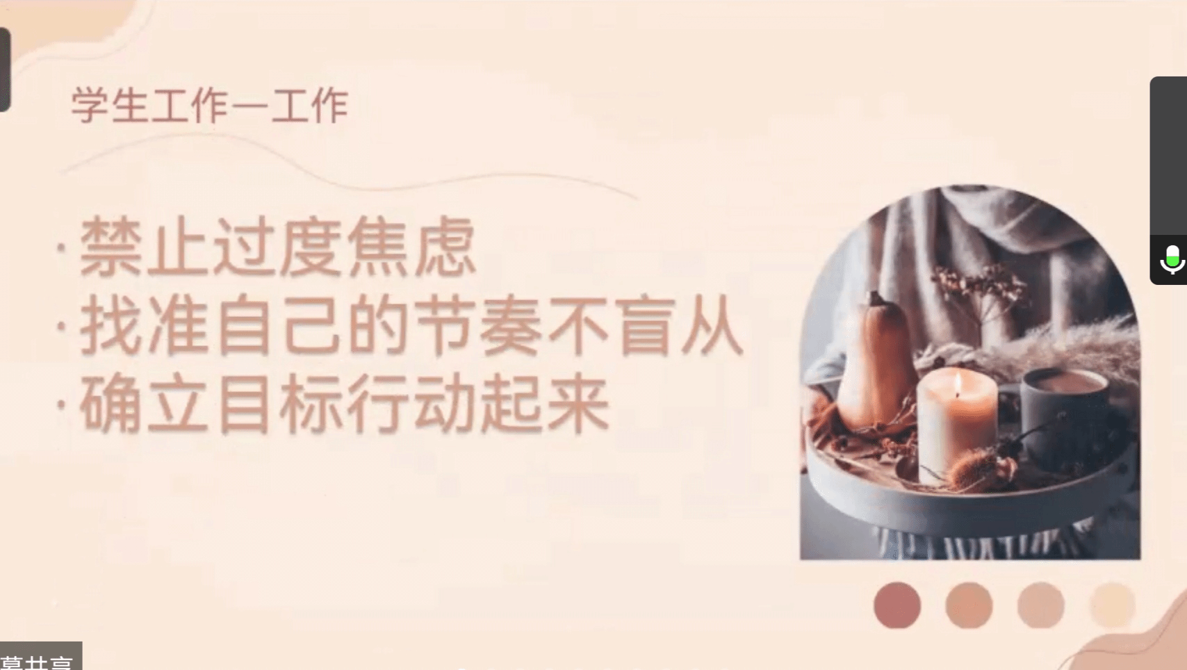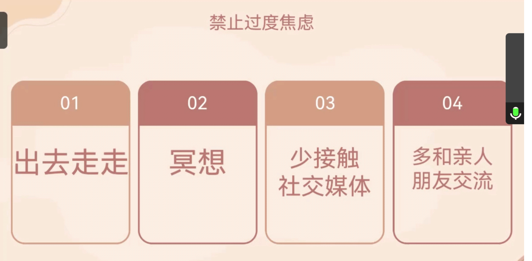 张慧校友从校园学习,组织工作,备考方式等多方面进行经验分享,给正处于迷茫中的我们指引方向,也给予了我们学习与工作上的建议。在学生工作方面,张慧学姐给了我们三条建议:禁止焦虑,确立目标并行动,找准自己的节奏不盲从。在禁止焦虑方面,张慧校友提出了出去走,冥想,多与亲友交流等解决方案。为现阶段,部分有着高度焦虑的大学生们提出了可以付诸实践的行动方案。我们可以去旅游,去冥想,去与亲友交流......从中缓解焦虑,找到自己。