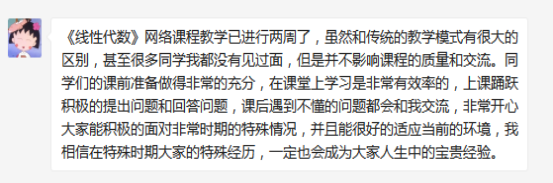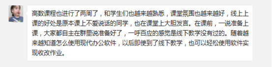 三位数学老师有较丰富的线下授课经验,但对于线上教学新形势,仍然需要经过从探索到熟悉再到灵活运行的逐渐适应并完善的过程。老师们也希望能够借此机会,深化教学改革和教学创新,不断提升自己的教学能力。每次线上教学之后,三位老师都会针对课程效果进行讨论,努力探索更好的线上教学模式。并且及时对学生任务、作业等进行批阅反馈,灵活调查,收集学生的问题、意见和建议,及时回应和指导学生课后学习,借此总结学生学习中存在的问题,反思教学方法,优化教学设计。努力保证教学质量的同时,让学生在家中有更好的学习体验,并且学有所得。