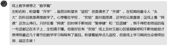 疫情防控时期,大家都以不同的角色“战斗”,虽然我们不能像白衣天使那样奋战在防疫第一线,但网上教学也是我们教师的战场,我们将以更努力、更负责的态度守护好同学们,确保把知识高质量地传授给学生们。期待春暖花开,大家早日重回美丽的校园。