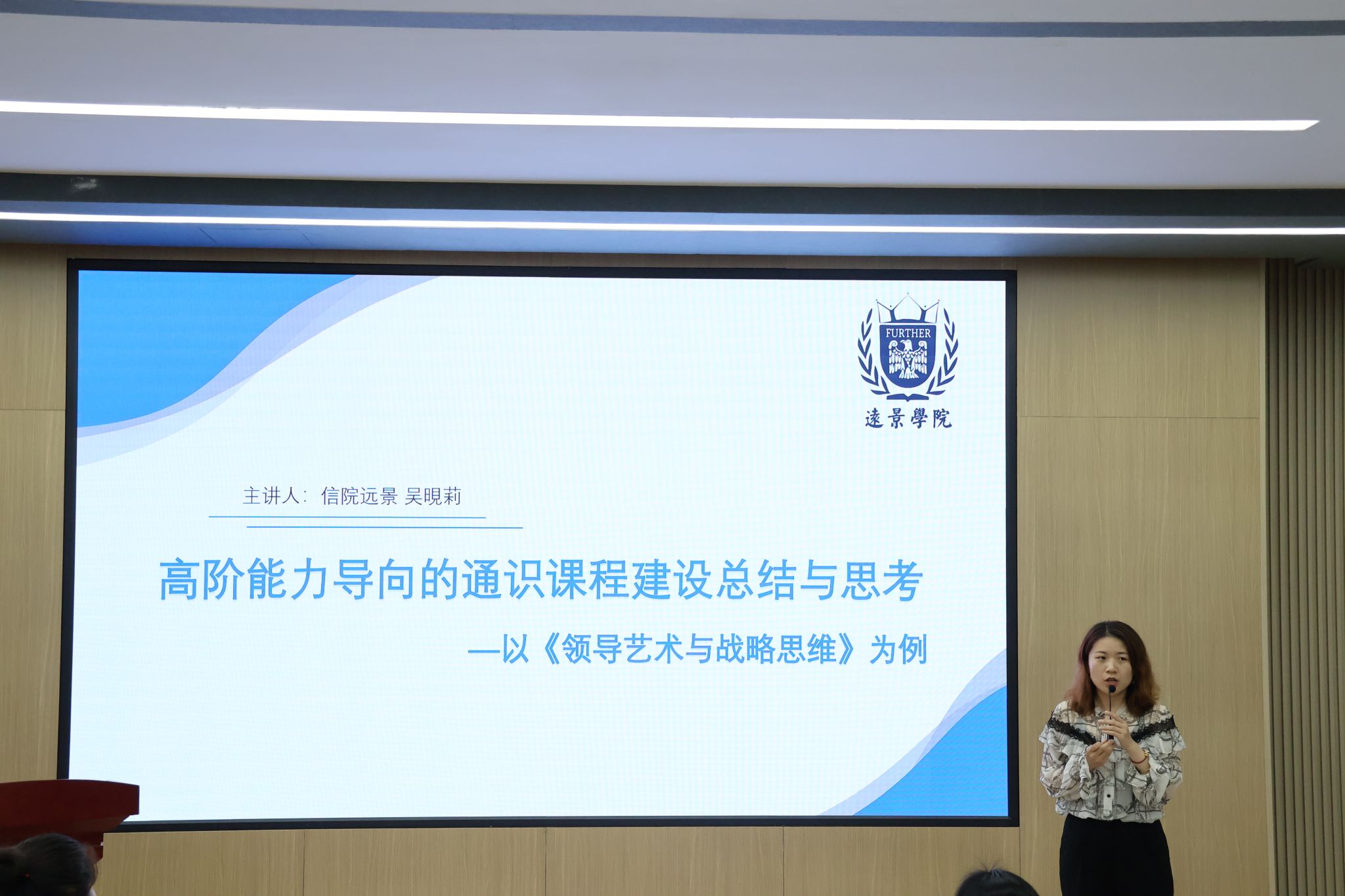 会议中,远景学院青年教师黎美茜就学院英语课程建设情况进行汇报。通识教学部王诗源老师进行了《苏格拉底 孔子所开创的世界》课程的建设现状的汇报。两位老师充分结合綦江学情,围绕通识教育理念、目标,扎实做好课程改革研究和教学创新的实践和思考,受到与会领导和老师们的一致好评,大家纷纷表达了对通识教育新生力量强劲势头以及綦江校区良好的教学氛围的肯定。陈春苗副校长对老师们在綦江校区通识教育建设期做出的努力表示感谢,同时也期望有更多的机会共谋发展,守望相助。