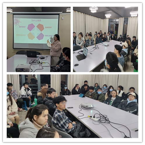 活动伊始,曾老师通过一个小调查了解了同学们的考研意愿,然后通过与同学们的交流,了解同学们为什么考研。不少同学都表示考研可以提升学历、追求名校、躲避就业压力、为找工作增加砝码等等。针对回答,曾老师通过身边人的例子告诉同学们通过考研更多要去追求自己心中的天地,实现自己的人生价值,不为现实所羁绊。曾老师的例子让在场同学感同身受,现场部分同学表示自身考研的激情被激发了,动机更加明确了。