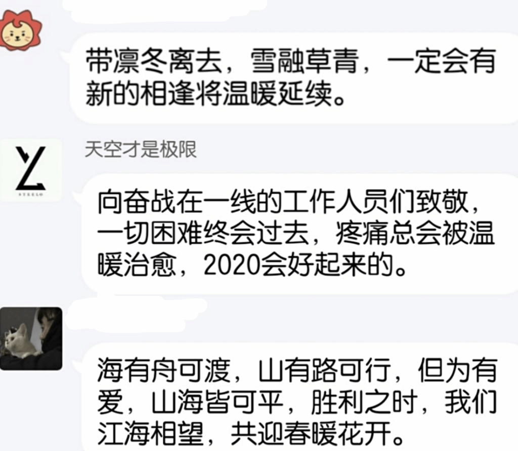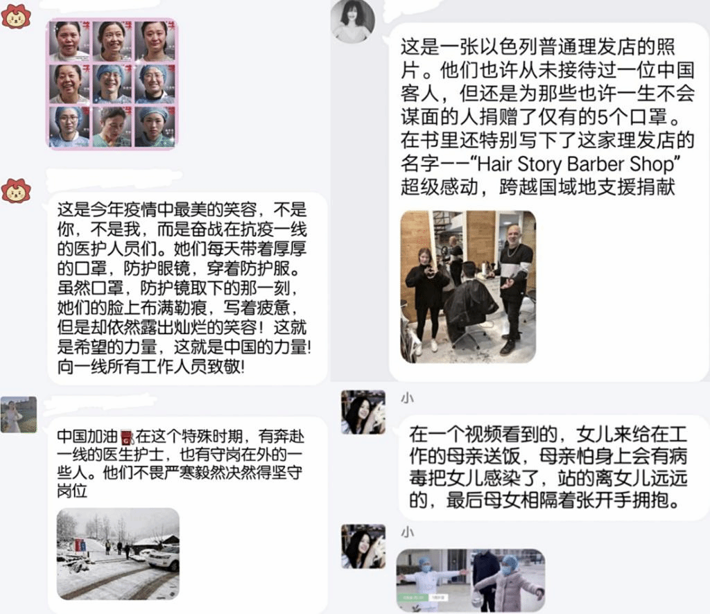 正如我们所见,随着疫情的迅速扩散,中国收到来自世界各国的关心与问候。身为中国青年的我们也在努力着,我们也在进行一场爱的接力,每一个为此而祈祷、努力的人都应拥有一枚耀眼的勋章。活动中,同学们在线上分享出在疫情期间自己认为最感动的疫情图片。这些图片里有疫情一线医护人员一直奋战仍充满生机与活力的笑容;有被口罩勒出深深白印的交警大叔;还有在线比心、为武汉加油的平凡市民……他们在我们心中永远是最美的!