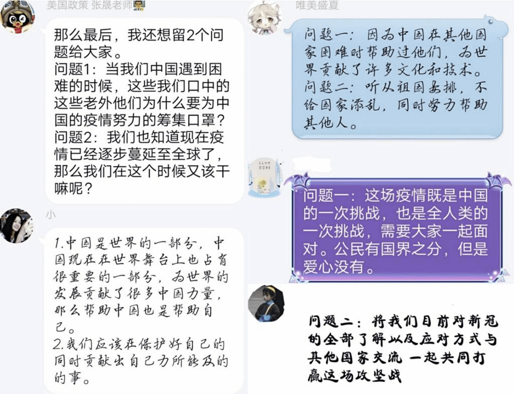那么,为何中国遭受危难时会有其他国家伸以援手?面对全球性的疫情时,我们又应该采取何种态度与措施?张老师的提问引人深思。“这场疫情既是中国的一次挑战,也是全人类的一次挑战,需要大家一起面对。公民有国界之分,但爱心没有。”艺术传媒学院,别都书院的唐国权同学分享道。“我们应该积极配合政府,自觉隔离,不信谣、不传谣,多去做志愿服务贡献自己的一点力量”……同学们都有感而发,也正如张老师所说,同学们的回答都是一份爱,当这些小爱汇集在一起时就是一份无私的大爱。