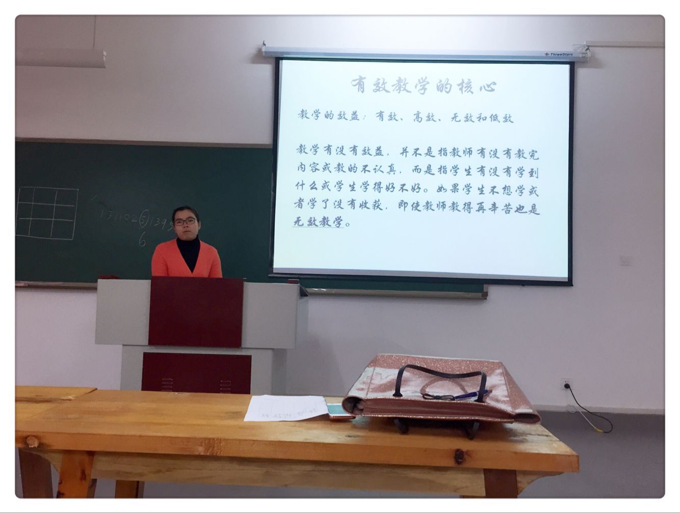 首先侯老师向大家阐述“什么是有效教学”,有效教学即有效率,有效的教学。如何在教学中实现高效率?侯老师强调要重点关注学生,关注学生的学习情况和需求,关注教学效益。让学生们在课堂上有所收获,更好地实现教学相长。其次,要关注可测性和量化。要求老师时刻关注学生的动态,及时给予学生肯定和鼓励,充分激发学生的学习兴趣和积极性。侯老师提醒大家在教学中一定要善于总结和反思,提出“实践——反思——再实践——再反思“。之后就如何能取得良好教学成果侯老师结合自己的教学经验分享了一些方法:课前有效准备,课堂有效组织及课后有效练习。