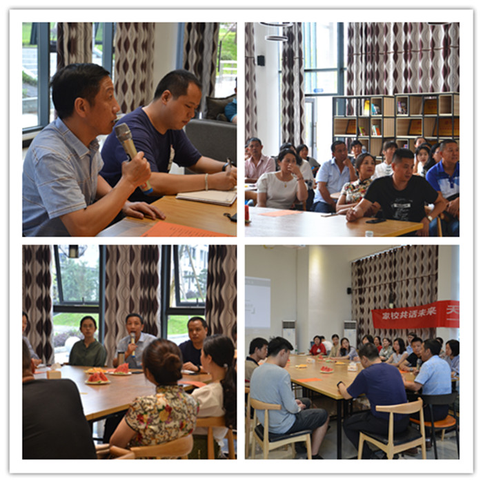 在领略完课堂风采后,上午10:30,家长们再次来到天渠书院阅览室进行面对面座谈会。座谈会上主要以介绍学校育人理念,让家长们深入了解我校四位一体的育人模式为主。座谈会首先通过视频向家长们展现移通风貌,然后由外语系系系主任吴世银老师介绍外语系专业情况。吴主任说到,我们要把外语作为桥梁,跨过大洋,越过高山,向更高的领域前进!之后,由国际处的韦橙橙老师介绍了学校对我系的人才培训政策,学生出国学习交流,无论是跨洋还是四位一体的人才培育下,都旨在为社会培养出更多完满的中坚力量。之后分别由汇江书院综合办公室主任程晓娇老师介绍了学校的书院制文化。通过现场播放外语系本学年完满教育风采视频,让家长们直观地感受到了外语系完满教育的活力,随后2019届毕业生二届三任学生书记陈星宇同学作为代表分享了她的四年完满之路,从羞涩到成长、从不敢开口到侃侃而谈,三年的志愿服务体验,足以让她成长蜕变,华丽变身。接着,李静老师作为教师代表发言,介绍专业素养的重要性。在随后的自由交流换届,家长们就专业学习、书院环境等与在座老师做了充分交流。最后,家长们、老师和同学们在天渠书院前合影留念。留下的是永恒的照片,记住的是永远的回忆。