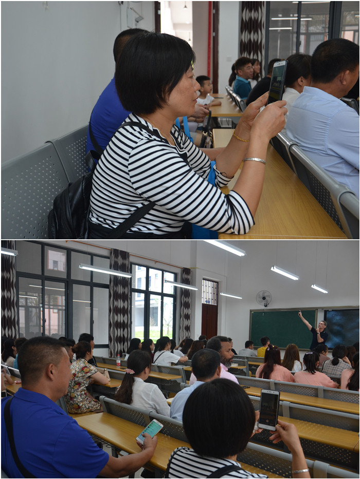 为了让家长们更加深入了解同学们的学习情况,上午10:05分在辅导员老师的带领下,他们来到了外教Clive的口语课堂。在幽默、诙谐的浓烈英文学习氛围里,家长和同学们都积极与clive互动,并称赞外教Clive 的中文很棒,对外教Clive给予充分了肯定。虽然大部分家长听英文听的懵懵懂懂,但家长们也想努力融入孩子们的世界里,了解孩子的专业学习。家长们从未把自己的目光从孩子的身上移走,并用手机拍照记录他们的学习瞬间。