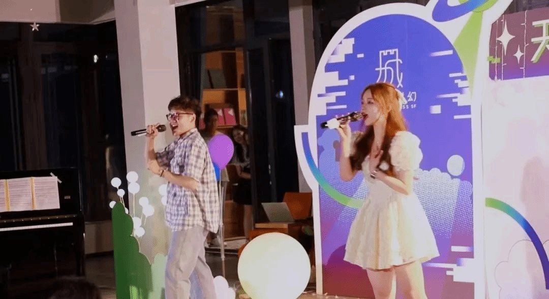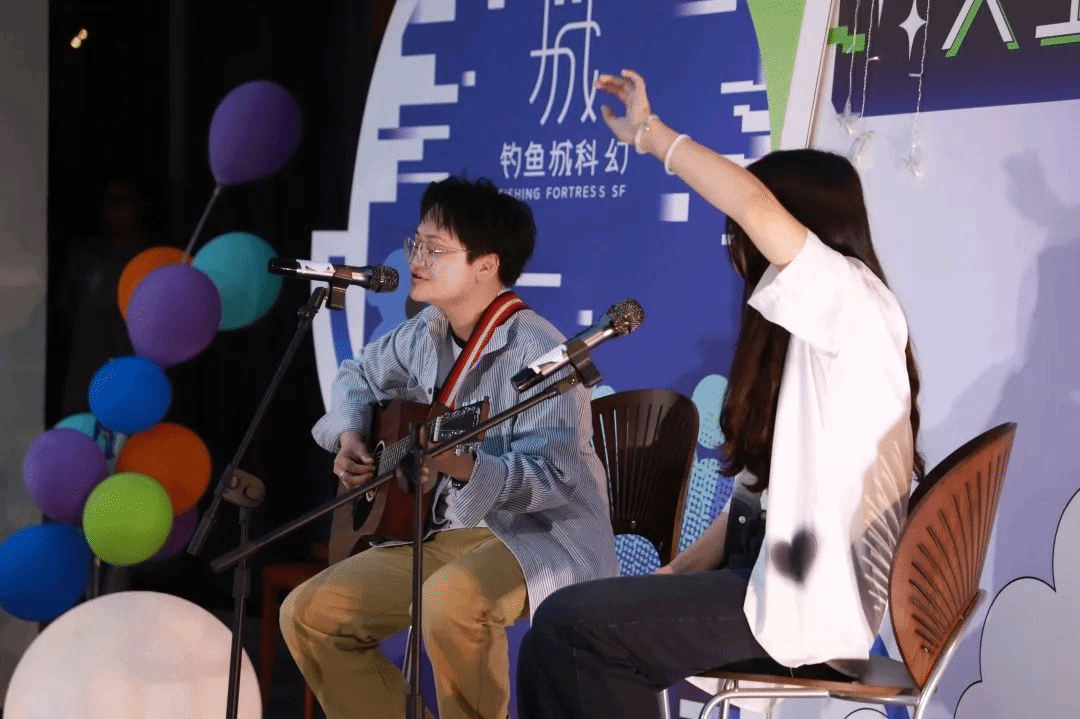 在这种气氛里,太古科幻学院院长张冉和蓬莱科幻学院首席作家杨平从收到登台邀请到做出决定,用时不到五秒。张冉老师边弹边唱;杨平老师目光炯炯,专注节奏。一首轻松惬意略带伤感的《男孩别哭》就此流淌