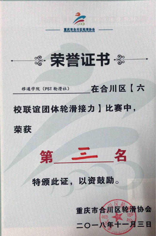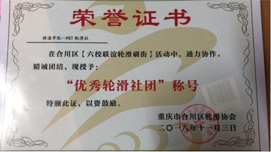 精通轮滑的高手向所有轮滑爱好者展示刹车技能,众多轮滑爱好者相互学习与玩耍,气氛一片火热。此外,在合川区轮滑协会的组织下,现场举办了轮滑团体拉拢比赛,我校轮滑社取得第三名的优异成绩,同时获得合川区轮滑协会“优秀社团”称号。