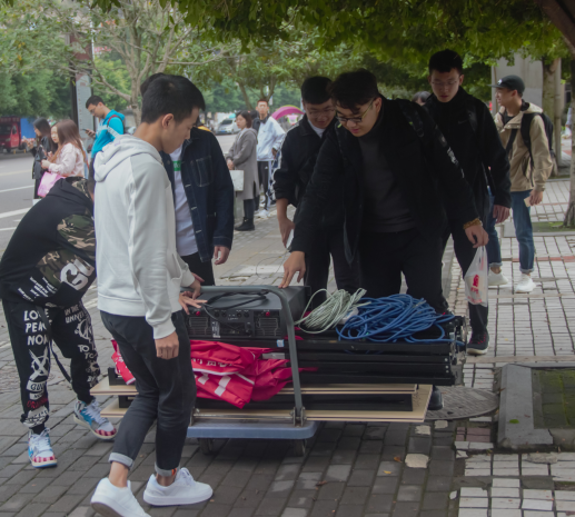 (工作人员们在马路边上拉小推车去往活动目的地)
