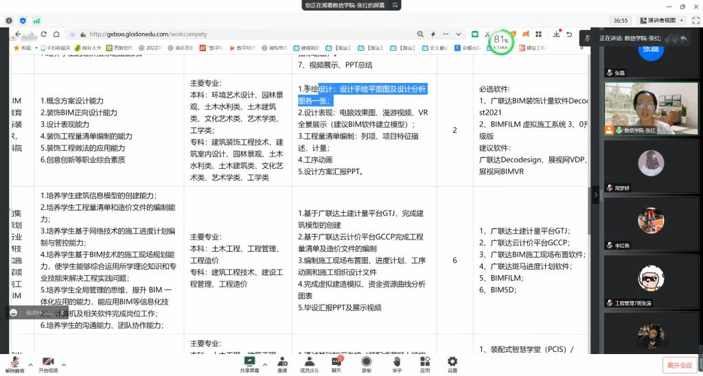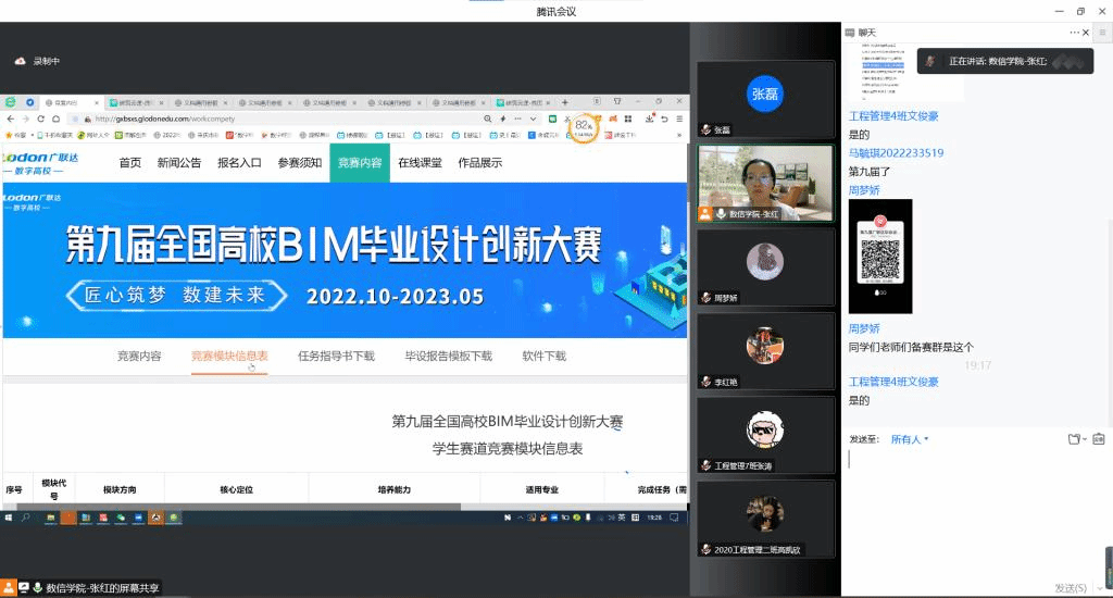 本次会议主要是针对第九届全国高校BIM毕业设计创新大赛而发起的赛制解读。周主任首先为学生讲解本次赛事的性质、级别,让社团学生了解了参加大赛的重要性,并解读了作为A类学科竞赛费用的学校政策,打消了学生参赛费用的后顾之忧。随后由张红老师进行讲解。从赛制规则、学生团队组建、学习任务及其分工、获奖作品学习等四个方面进行了深入解析。张老师凭借多年组织学生参加学科竞赛的丰富经验,分别对参赛的9个模块进行讲解,并将收集到的历届参赛资料毫无保留地共享给学生,带给参赛学生满满的干货。最后李红艳老师就组建团队、目标设定等方面给学生提出了几点建议,并强调疫情期间要做好防护,不负青春和美好时光。