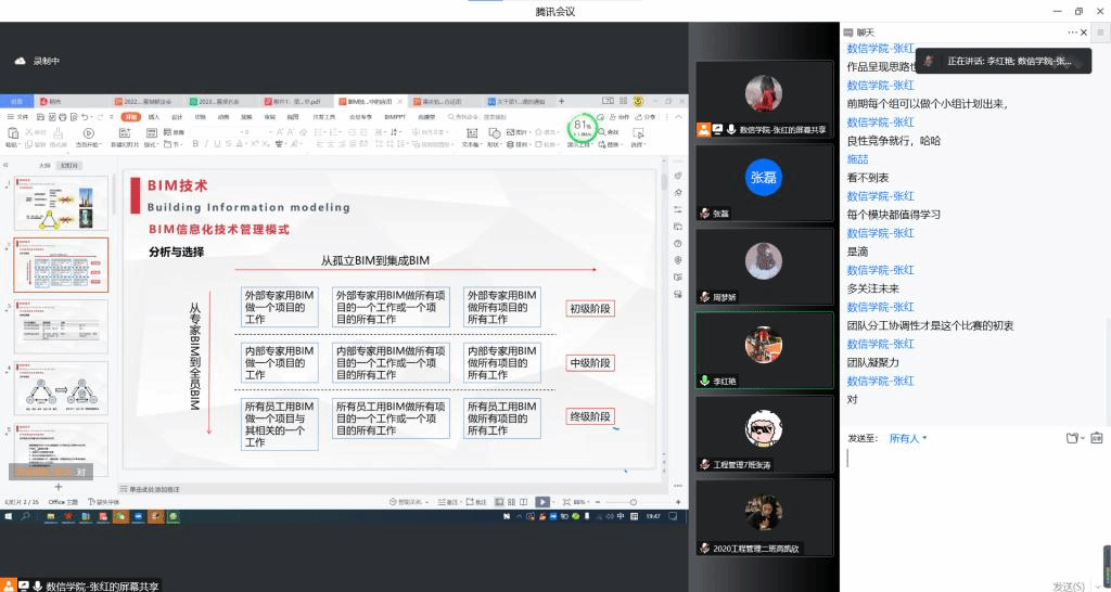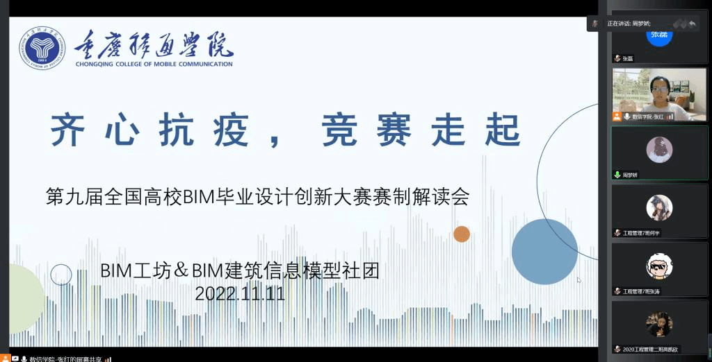 立冬刚至,奥密克戎也穿上马甲悄悄潜入三江之城。自11月7日后我校莘莘学子们在寝室,过起了深居简出的蜗居生活。为丰富学生被封在校的业余生活,使学生在单调的方寸之地充实大学时光,也为了在后疫情时代能占据择业的优势,BIM建筑信息模型社团及时召开了主题为“齐心抗疫 竞赛走起”的学科竞赛在线指导会。会议由数字经济与信息管理学院工程管理教研室主任周梦娇老师主持,张红、李红艳、徐桂宵、刘艳利等老师及56名社团成员参加。