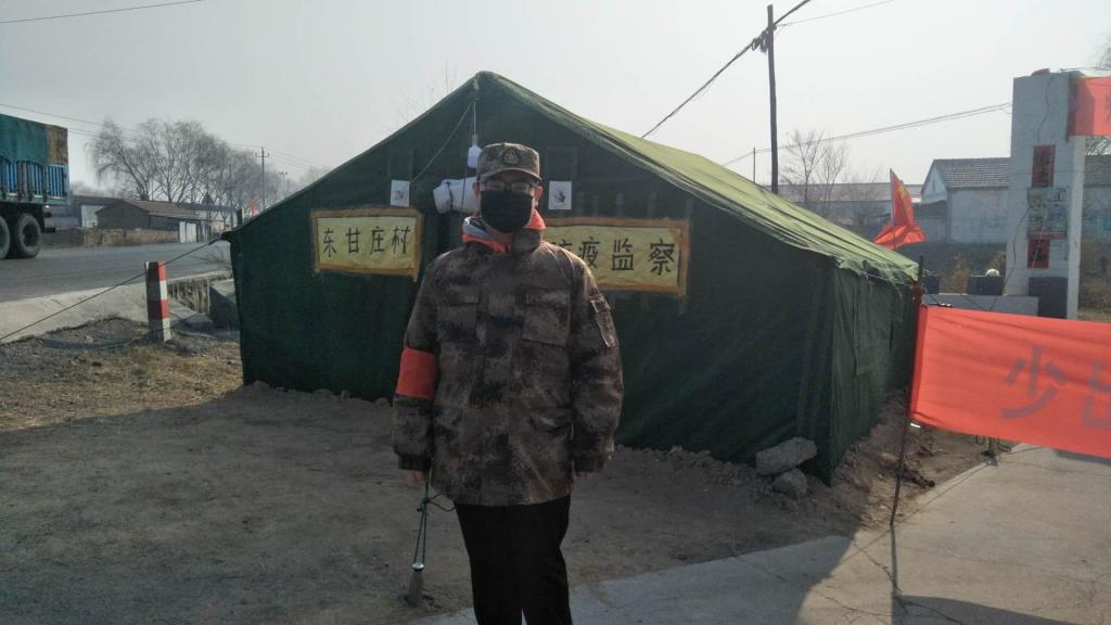 2020年2月1日起,他和村委会工作人员一道,每天早晨6时30分,穿着宽厚的防寒服,迎着北方凛冬的朝阳,挺立在东甘庄村村口,为家乡守护。11时30分结束站岗,和其他志愿者交接换班。