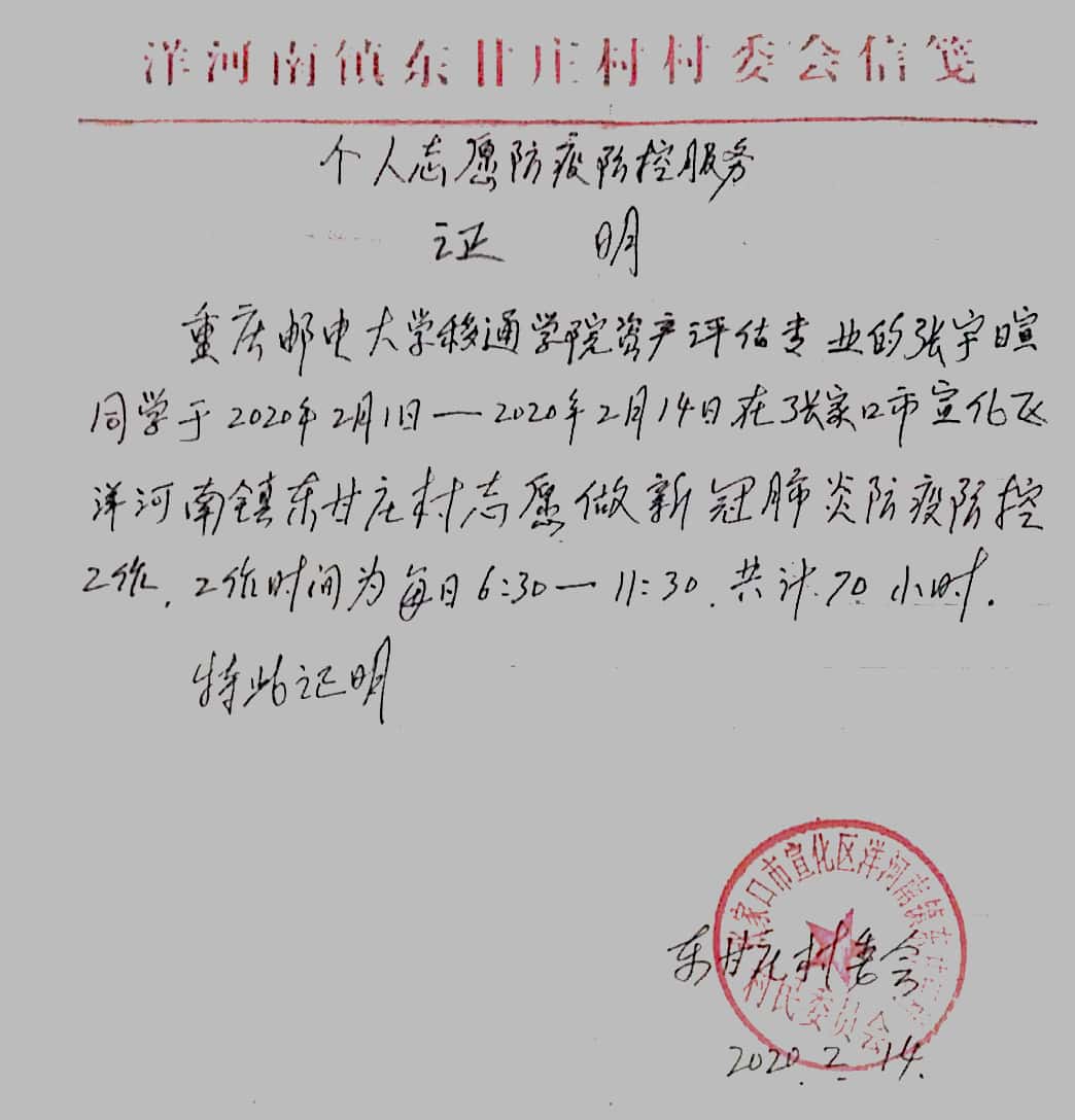 (张宇暄同学的志愿服务工作获得东甘庄村村委会的鼓励和肯定)