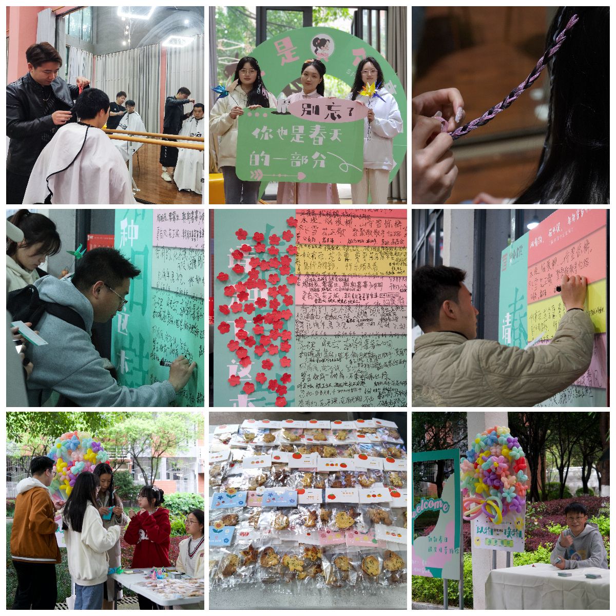 “二月二,龙抬头,风调雨顺好年头。”农历二月初二这天,许多人都要理发,俗称“剃龙头”,预示新的一年从头开始、好运连连。活动现场以此习俗为出发点设有“今日宜剃头”、“主打就是一个高马尾”体验专区,参与者体验“现代托尼理发”的同时,还可以与华韵汉服协会的同学一同进行高马尾编发与发髻装饰。此外,民间还有“春分吃春菜”、“迎春续春诗”的习俗,活动现场也邀请到美食协会为同学们亲手制作荠菜饼,传达着希望同学们春菜尝鲜,喜迎春天的美好祝愿。还有活动现场同学们续写的春诗:“风有约,花不误,年年岁岁不相负。”、“夏有风,花正浓,朝朝暮暮等重逢。”、“风不足,人初静,明日落红应满径。” 同学们用纸笔书写春天气息,句句朗朗上口,字字饱含深意,无一不传达出对春天到来的喜悦与期盼。