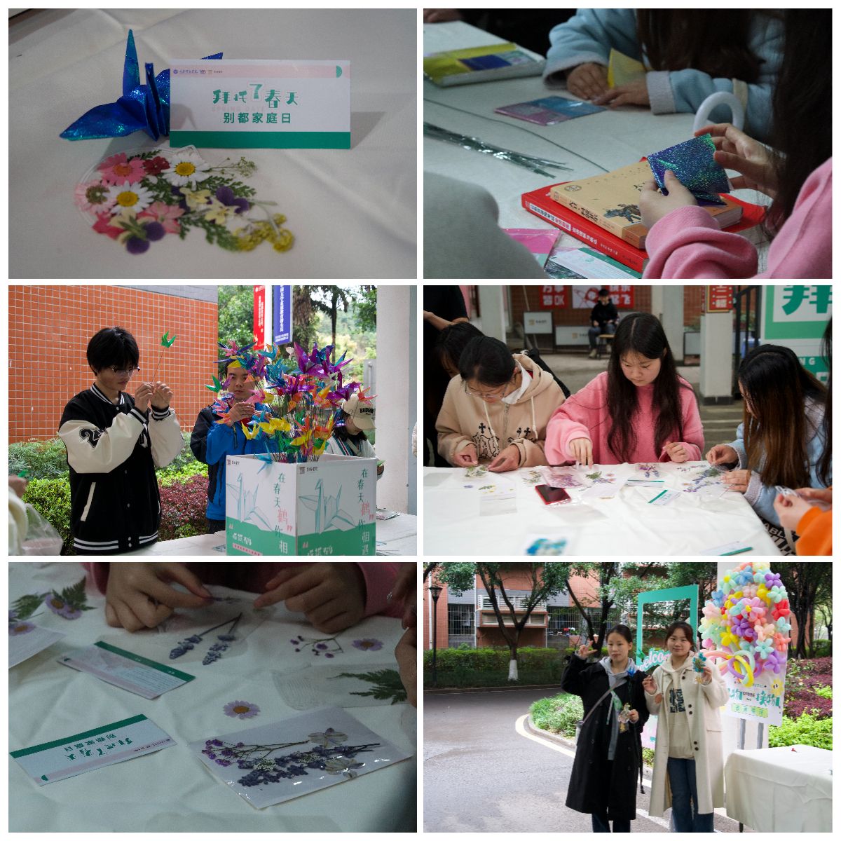 家庭日现场还设有折飞燕与压花签师生互动专区,师生同乐,共赴一场春日之约。折飞燕互动环节,一张张七彩琉璃纸在同学们的指尖翻飞,象征着美好春日的纸鹤在空中飞舞,承载着师生共同的期盼与祝福;压花签互动环节,参与师生借花感受春意,以手工制作的方式亲身体验干花制作、书签设计等内容,强化动手实践能力的同时,增强家庭日的互动体验感。同时也希望借“花信风”的寓意,在书院社区中营造共享共进的朋辈氛围,共同构建出一幅其乐融融的师生交友圈。