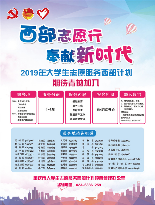对于每个应届大学毕业生而言,选择去西部都是一次新的机遇、新的挑战。在那里,你们将获得施展才华,实现人生价值的广阔舞台。那里有十分贫困的地方与许多想象不到的困难和考验。在那里,你们既会感受成功的喜悦,也会经受生活的磨炼、直面失败与挫折的挑战。但是我们坚信,在这一段奉献的经历中,你们将收获宝贵的精神财富,提升职业技能和自我发展能力,为今后事业的成功奠定坚实基础。