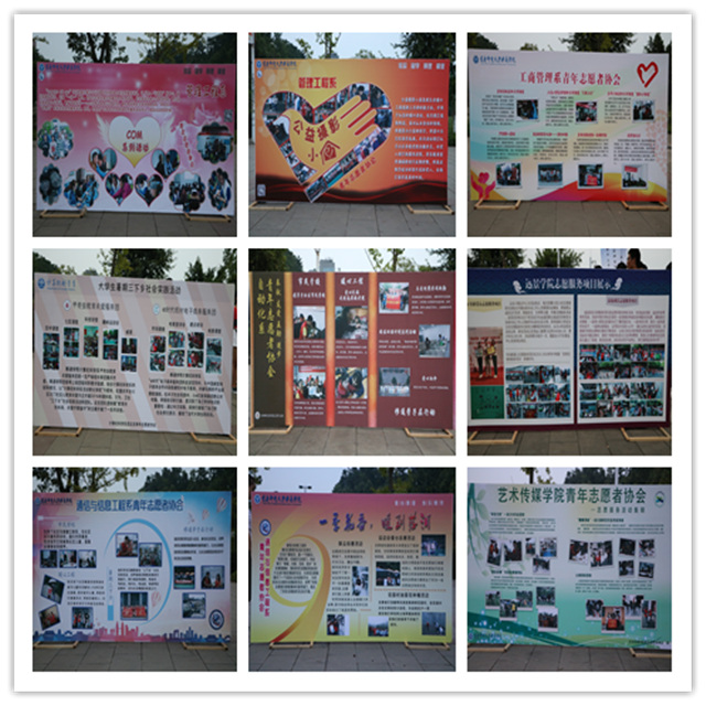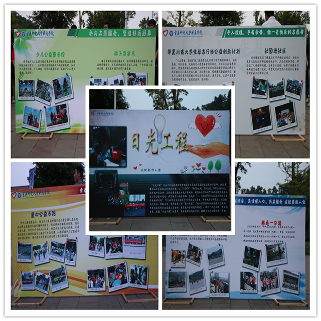 在一块块精心制作的展板前,志愿者们将唐老师团团围住,仔细听讲。本次展示的项目有日光工程、百人计划、爱心公益长跑、爱心集市、少儿公益图书馆、游子寄家书、华夏川商大学励志行动将公益创业计划、社团进社区、特色市民学校、移通一日游等,并为各院系单独设立展板。项目展将在教学楼广场面向全校师生进行为期一周的展示。