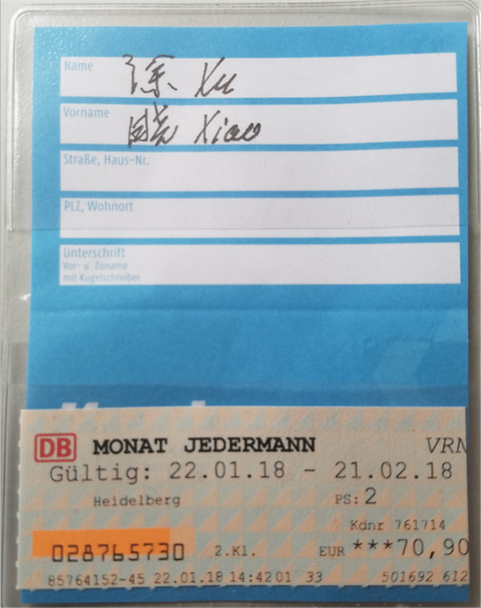 原来,经常在海德堡本地附近出行的人,早就购买了年票、月票之类的套票,比如像我,买的就是当地的交通套票,涵盖公交、铁路、轨道交通工具等,时间一个月,在此期间无需再买票。而另外需要长途出行的人,就会在火车站的自动售票机购票,方便快捷,但无论采取何种购票方式,你上任何一趟火车都无需任何检查验证环节,只是需要你自己看清楚站台号和列车编号,免得坐错。你坐多长时间,在哪里下车,全凭自觉,当然,铁路公司也不是没有任何检查环节。在每趟长途列车上,中途都会有专门的工作人员挨个查票,你没有乱来,自然不会心虚,坦然出示就可以了。这在城市公交车系统的管理上依然如此,你会看到汽车到站后人们上上下下,井然有序,汽车停靠时间极短,完全没有国内许多人全挤在汽车前门等待上车的那种情况,感觉你好像是压根就没有买票,随时随地,想上就上,想下就下,没人管你。可一旦查实你没有购票,后果也是很严重的!