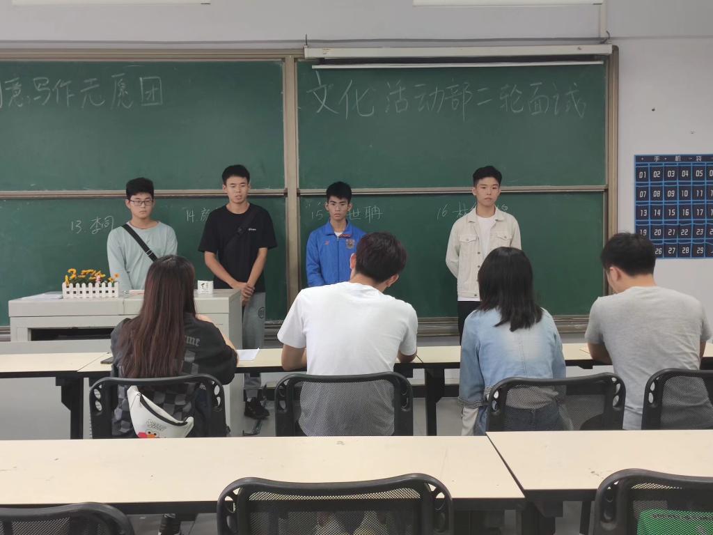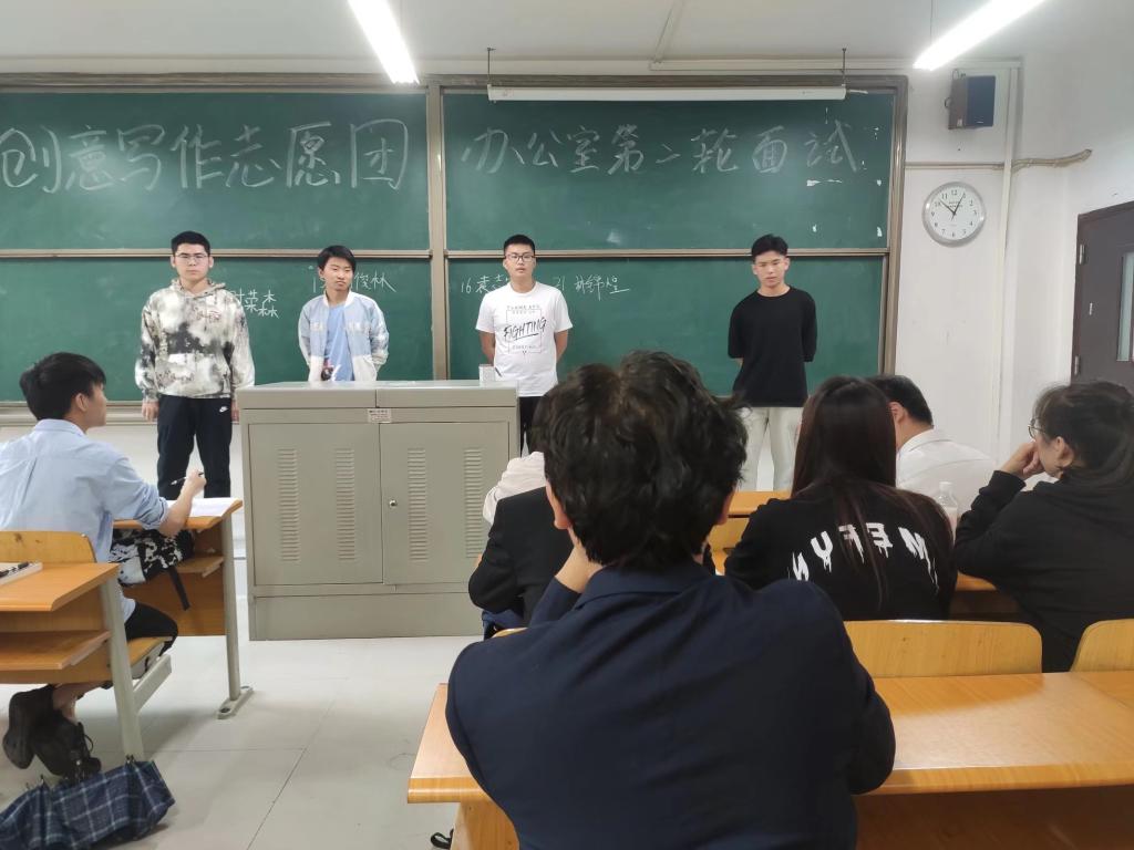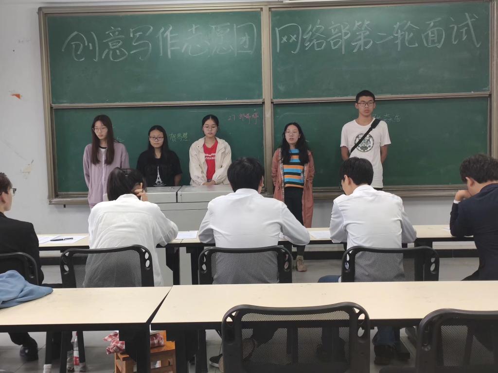 2020年9月24—27日,全校7600名新生中共有560人申请加入创意写作志愿团。经过第二届第一任创意写作志愿团主席会的慎重考虑,根据目前团长、部长的精力和实际管理能力,决定录取三选一,吸取180人。经过初试、复试两轮面试,最终有180人(分为四个部门)成为创意写作志愿团中的一份子。指导老师方刚、田一洁参与到两轮面试的指导工作中,田一洁老师安慰落选新生“不论有没有加入志愿团,友爱助人的精神都在心里。”